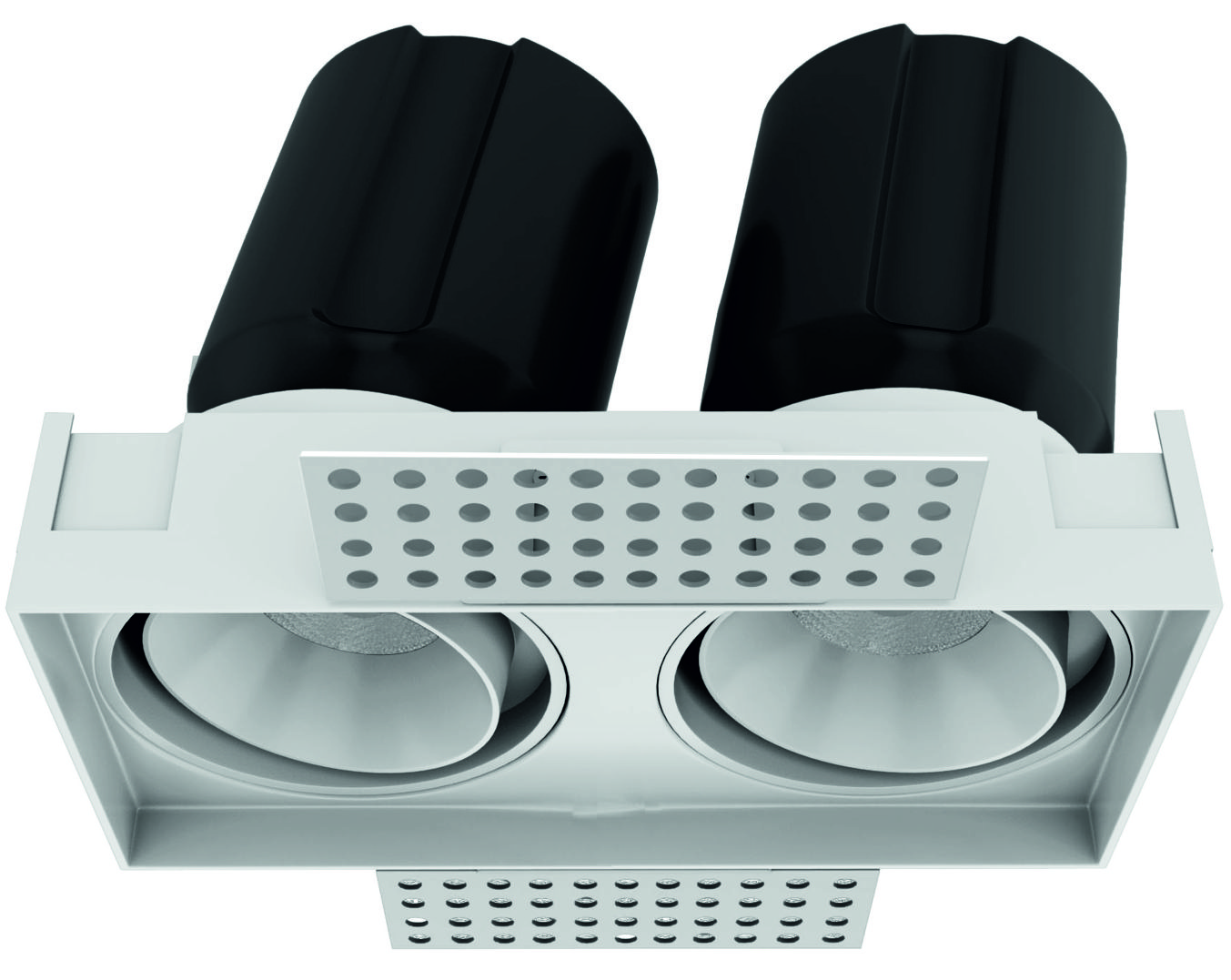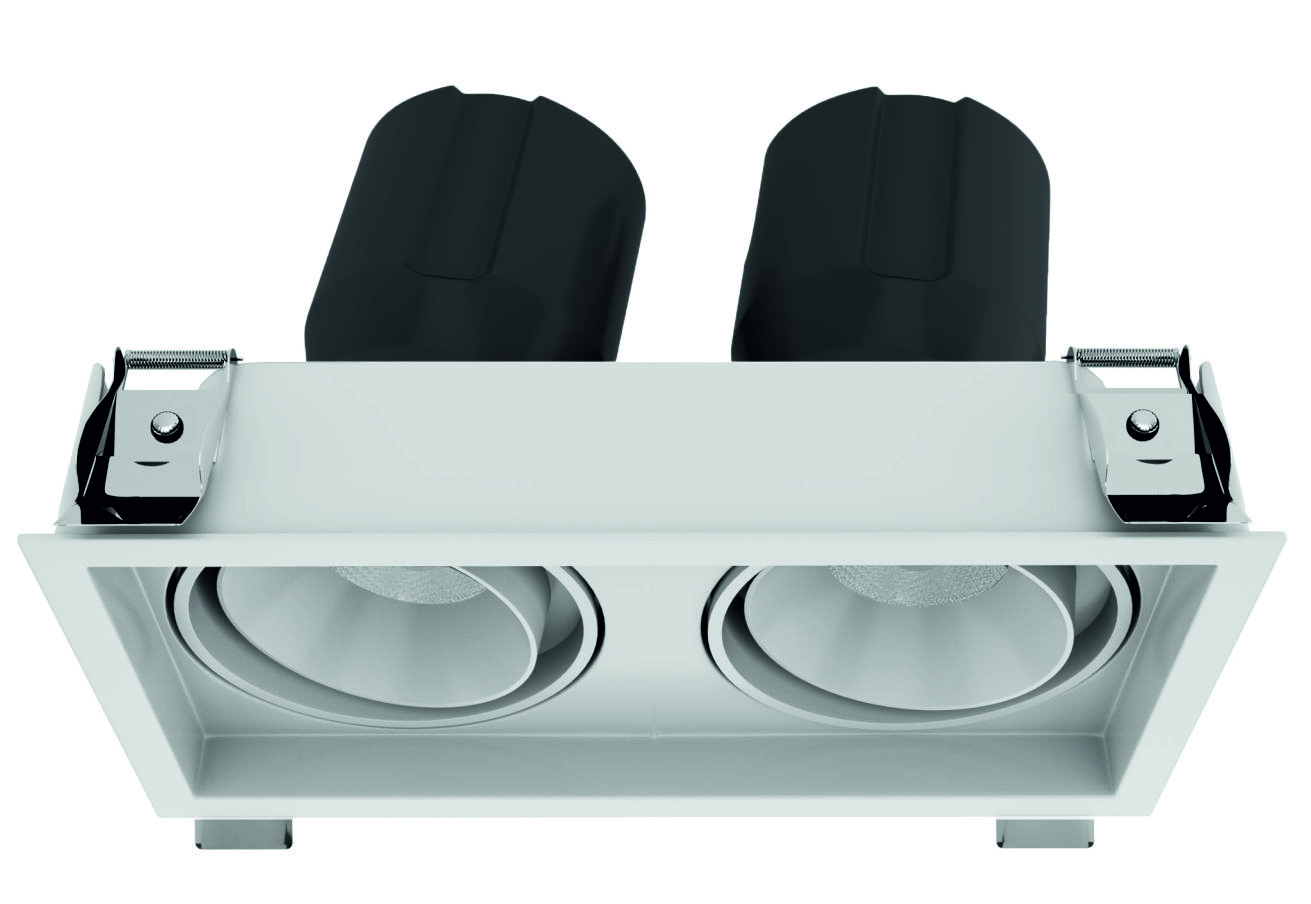 Tenace Swivel Frame models (Trim/Trimless) are high-performance linear downlights designed to house two adjustable light engines within a single rectangular frame. These fixtures feature two independent swivel mechanisms that allow each powerful Array LED (Typ CRI 95) to be aimed with full 360° rotation and high-angle tilt. The multi-module design delivers twice the accent power while the deep-recessed optics maintain the signature stress-free lighting experience.